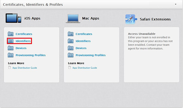 Log in Apple Developer Center, then click "Certificates, Identifiers & Profiles".
